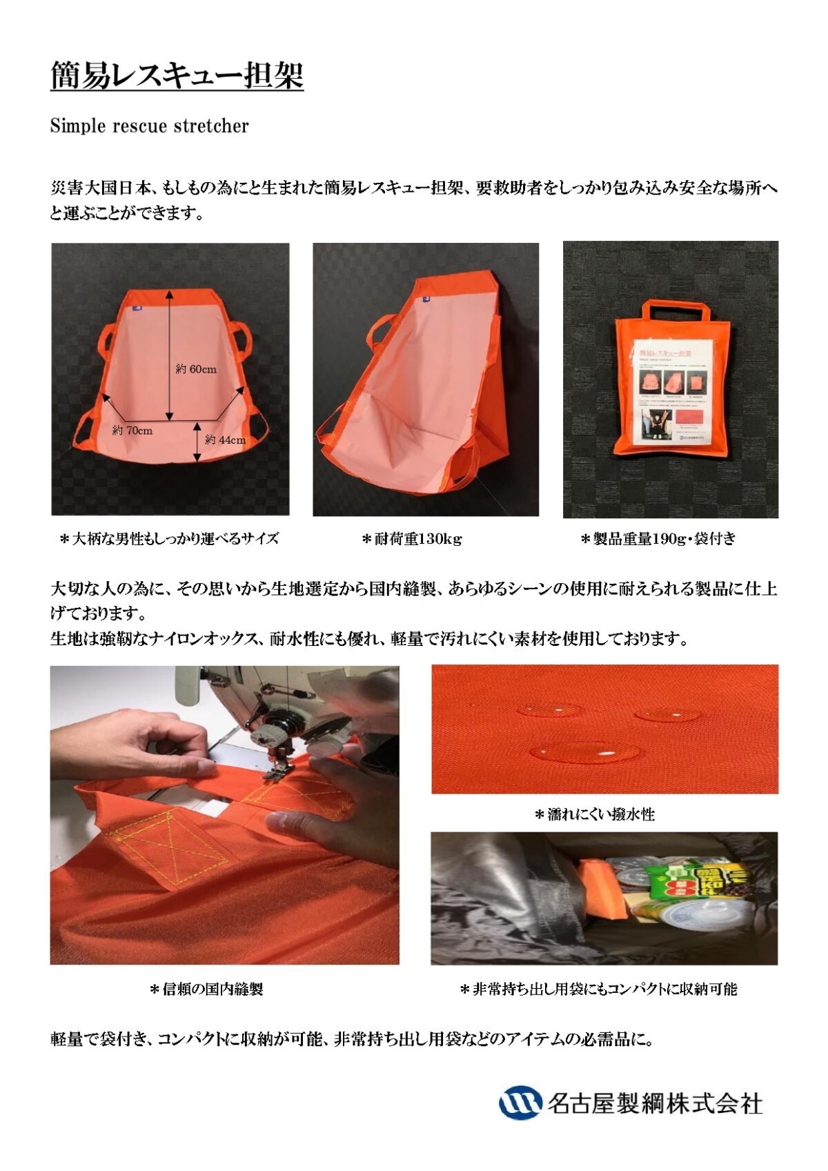 このたび、当社では「簡易レスキュー担架」を新発売致します。 いつ起こるか分からない災害に備えることが、災害大国日本では必要不可欠。 いざという時に、要救助者をしっかりと包み込み、安全な場所へと運ぶことができます。 名古屋製綱では、今後も様々な防災グッズの開発に取り組んでいきます。